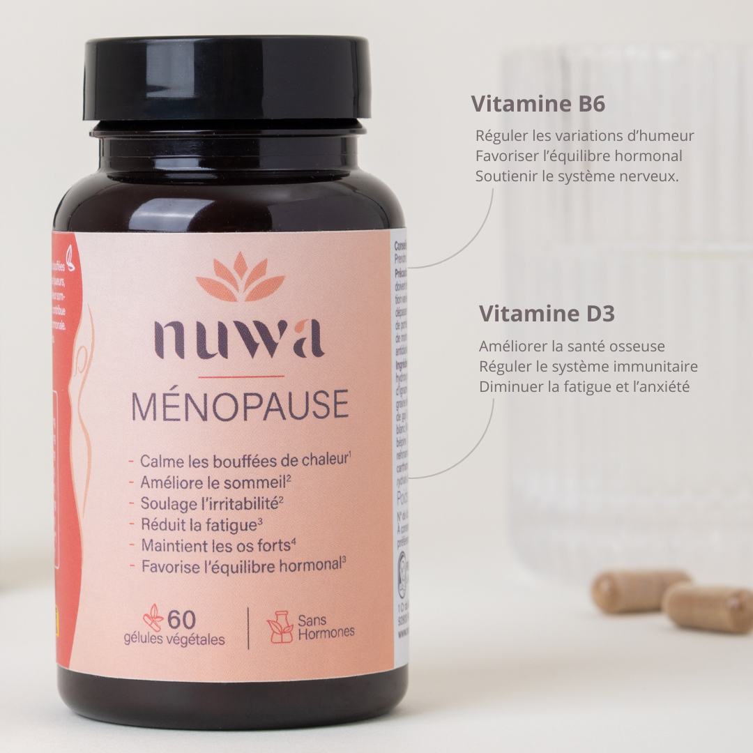 Bouffées de chaleur, sueurs nocturnes, irritabilité... Nuwa vous accompagne avec une approche douce et efficace. La cure MÉNOPAUSE est formulée pour apaiser les déséquilibres hormonaux et améliorer votre bien-être au quotidien durant cette période de transition.