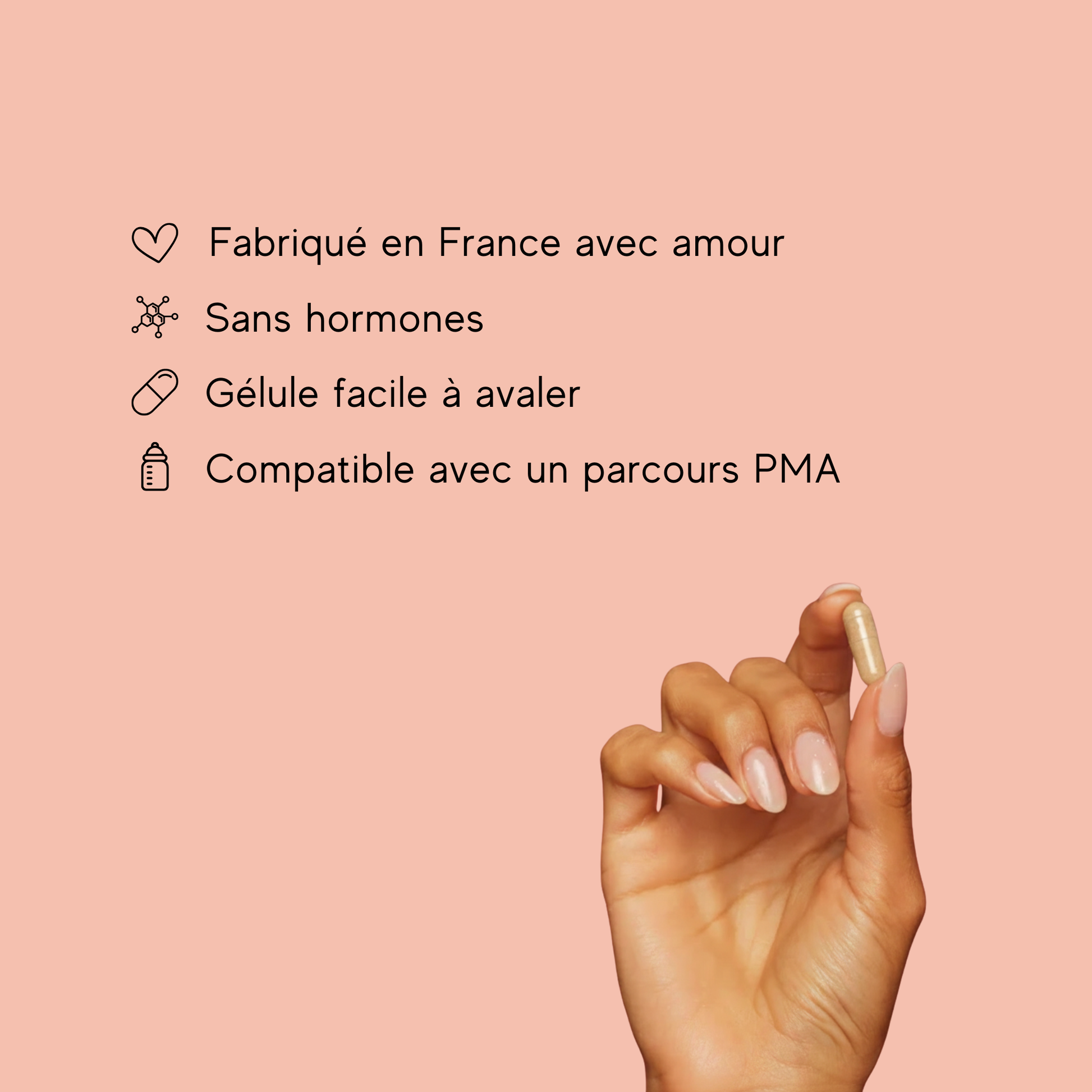 Vous pouvez commencer la cure à n’importe quel moment du cycle, y compris pendant les menstruations. Ce produit est compatible avec les parcours de PMA et de FIV.
