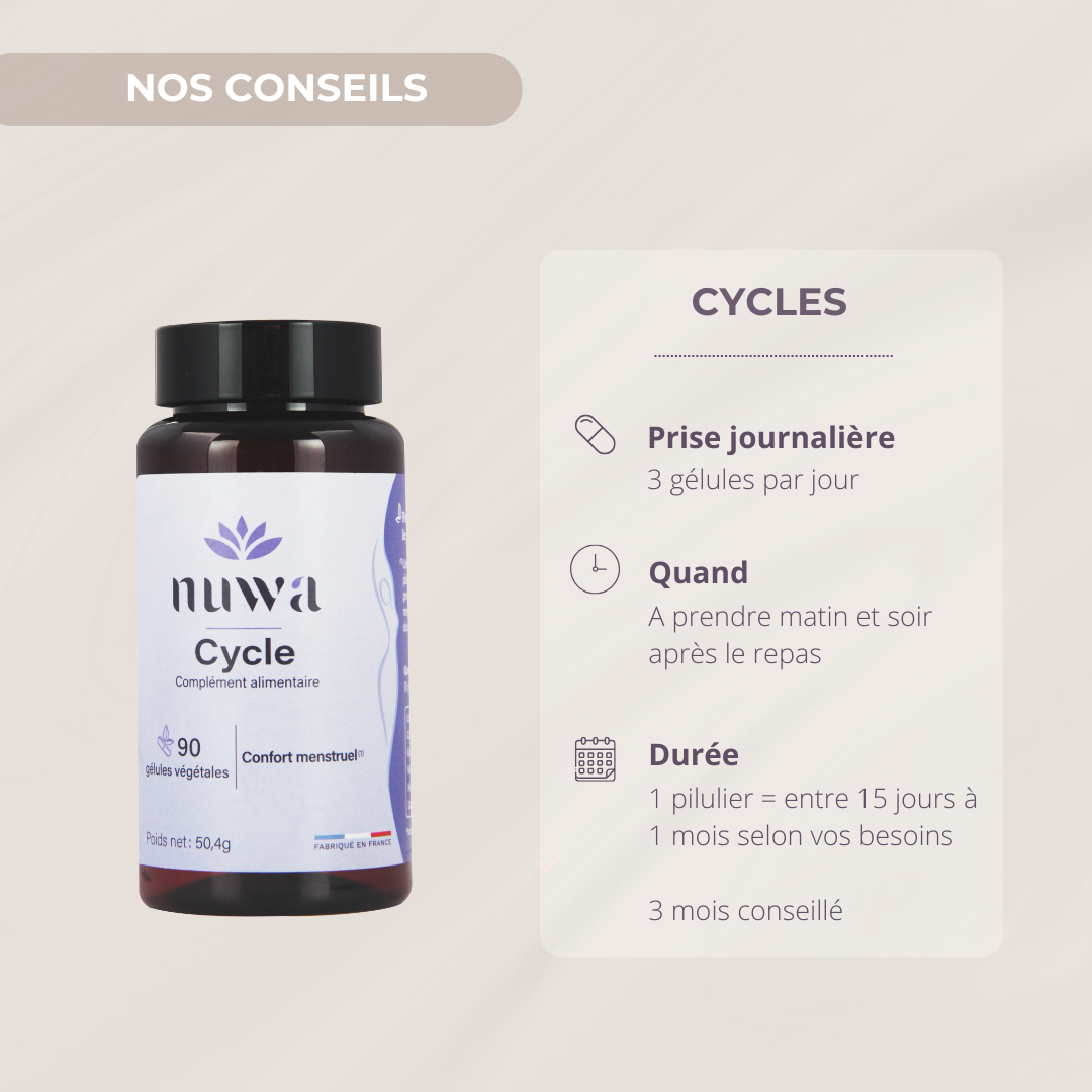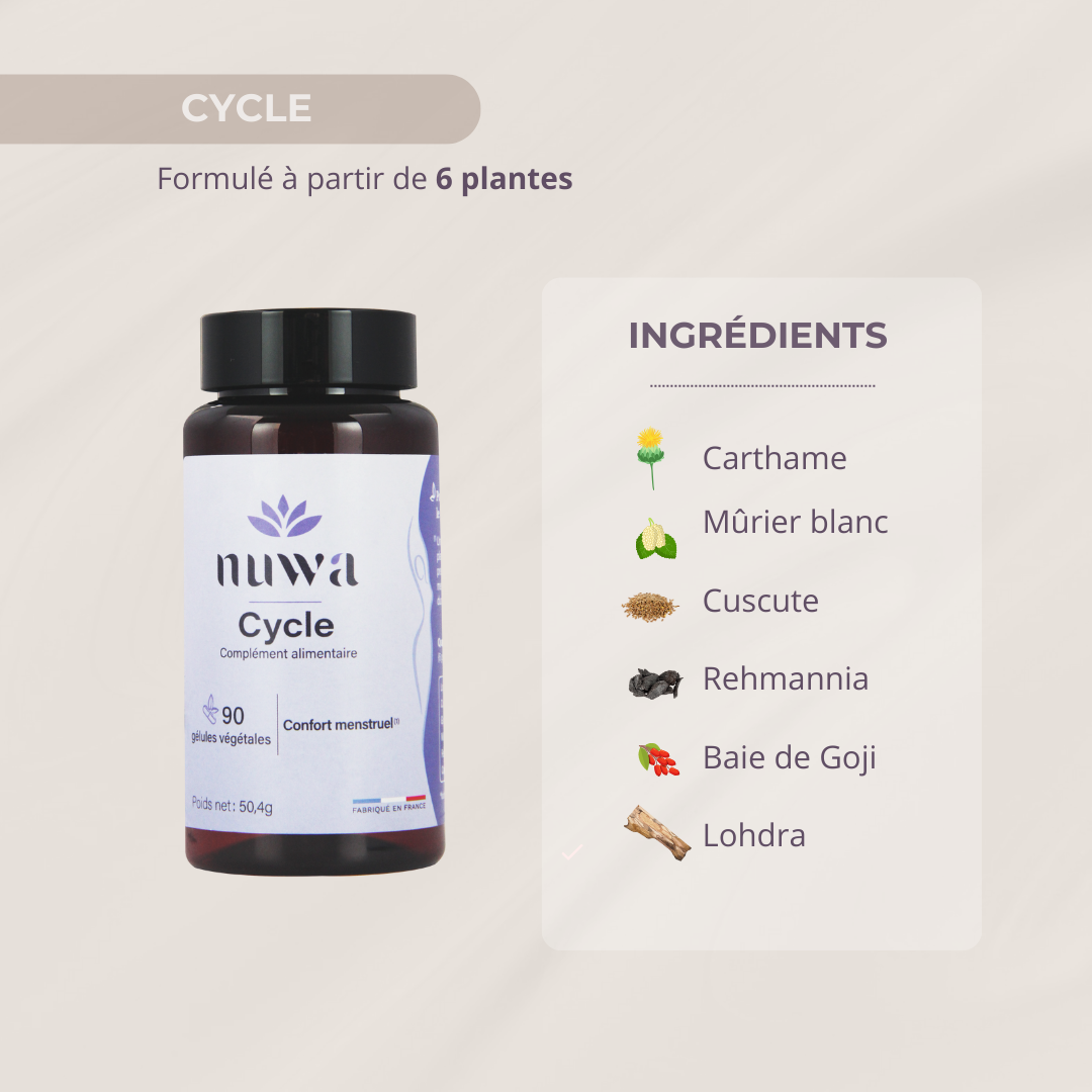 CYCLE est composé de plantes ayant des bienfaits antispasmodiques et anti-inflammatoires et lutte donc ainsi contre les douleurs. Si les douleurs sont persistantes et récurrentes veuillez consulter votre médecin traitant ou gynécologue.
