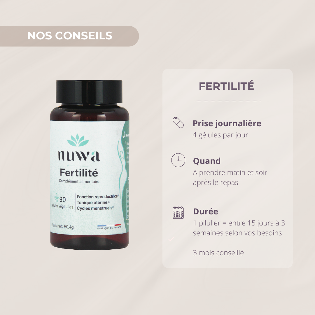 Nous vous conseillons de prendre le complément FERTILITÉ en continu, dès le désir d'enfant et jusqu'à la grossesse.