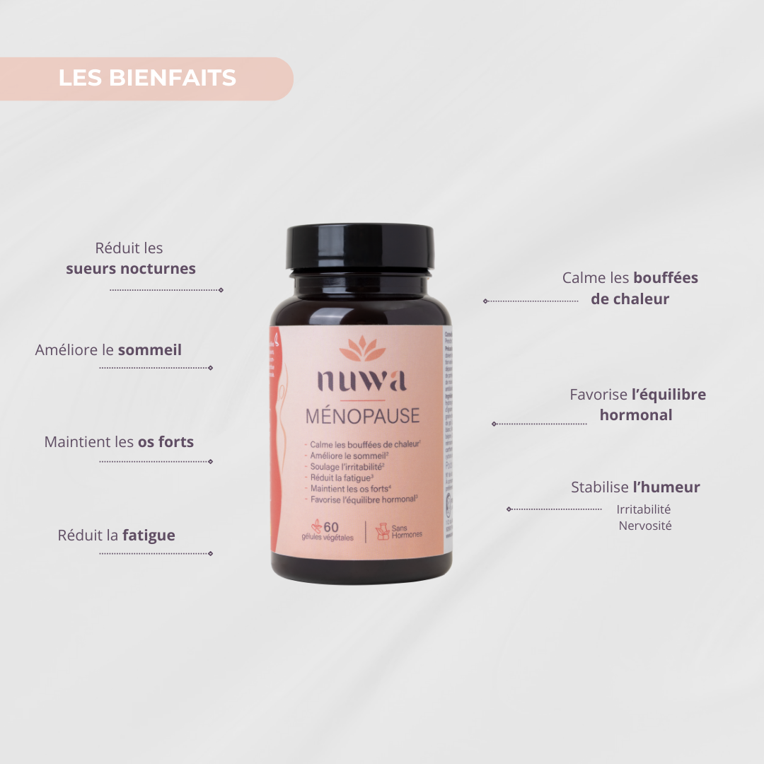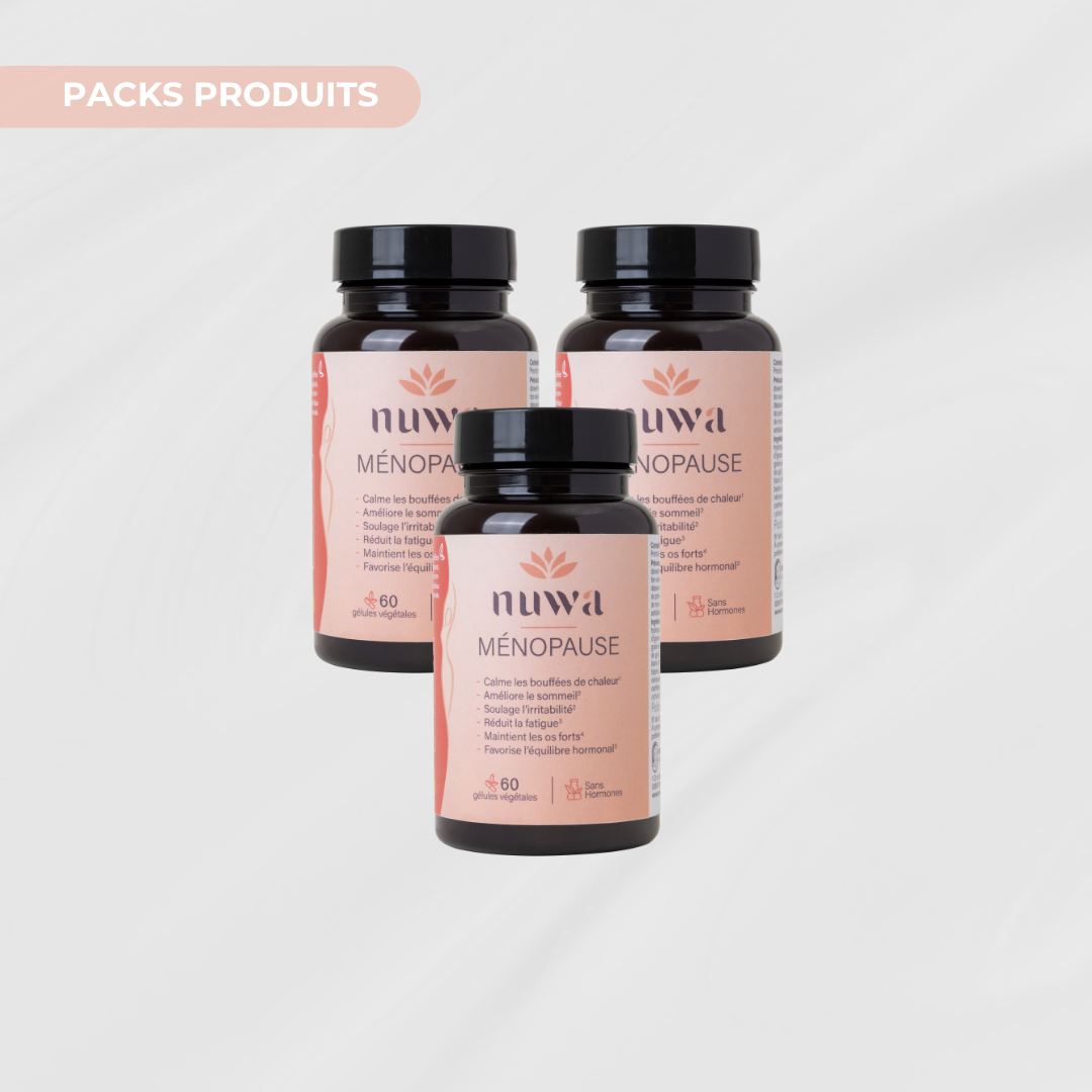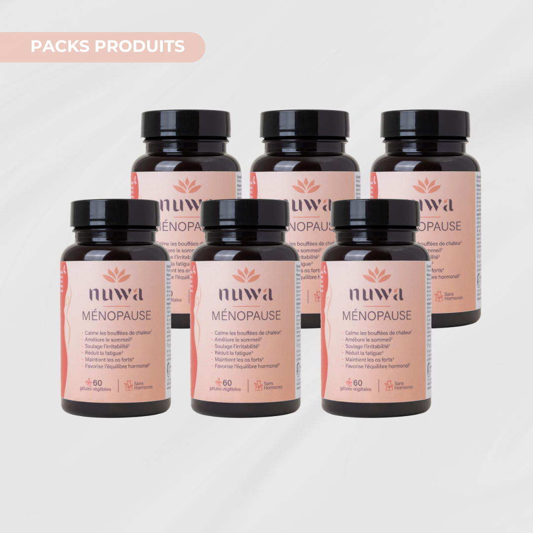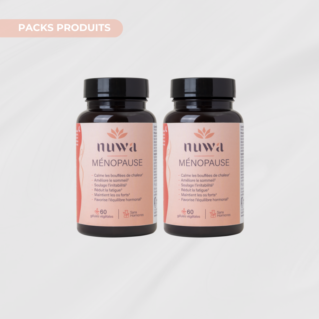 La ménopause n’est pas une fin, mais une transformation. C’est une étape naturelle de la vie, souvent marquée par des bouleversements hormonaux pouvant engendrer des inconforts physiques et émotionnels. Bien qu’elle ne soit pas une maladie, cette transition peut avoir un impact significatif sur le bien-être global. Et vous méritez le meilleur pour la traverser. Chez Nuwa, nous avons à cœur d’accompagner les femmes durant cette période avec des solutions douces, naturelles et efficaces, spécialement conçues pour les aider à retrouver leur équilibre et sérénité, grâce à une synergie d’actifs d'origine naturelle, choisis pour leur efficacité prouvée.