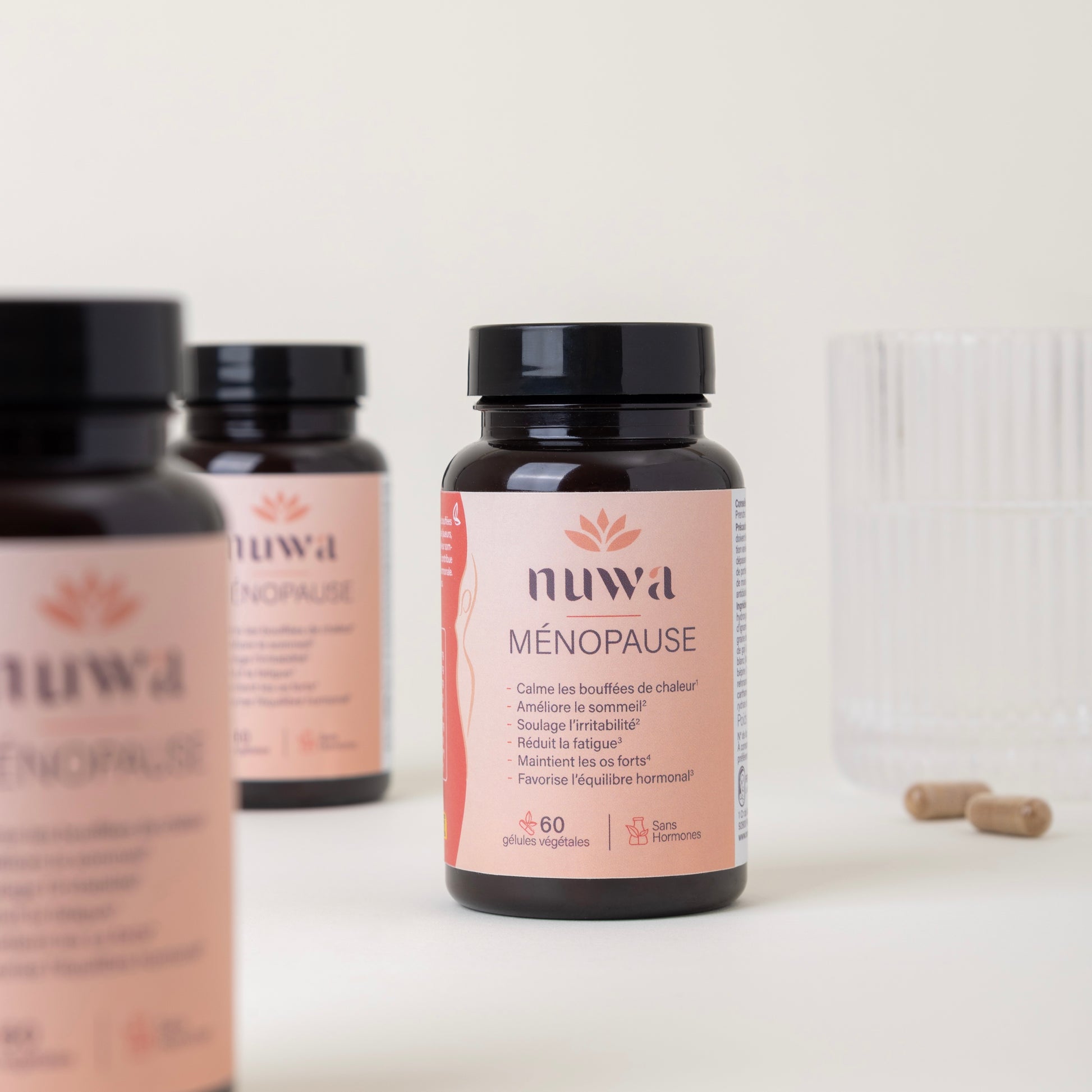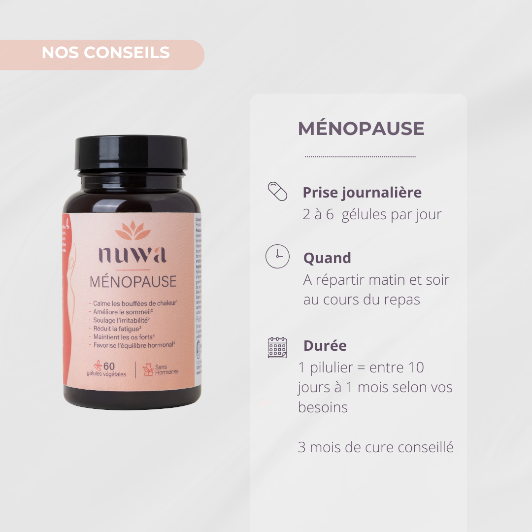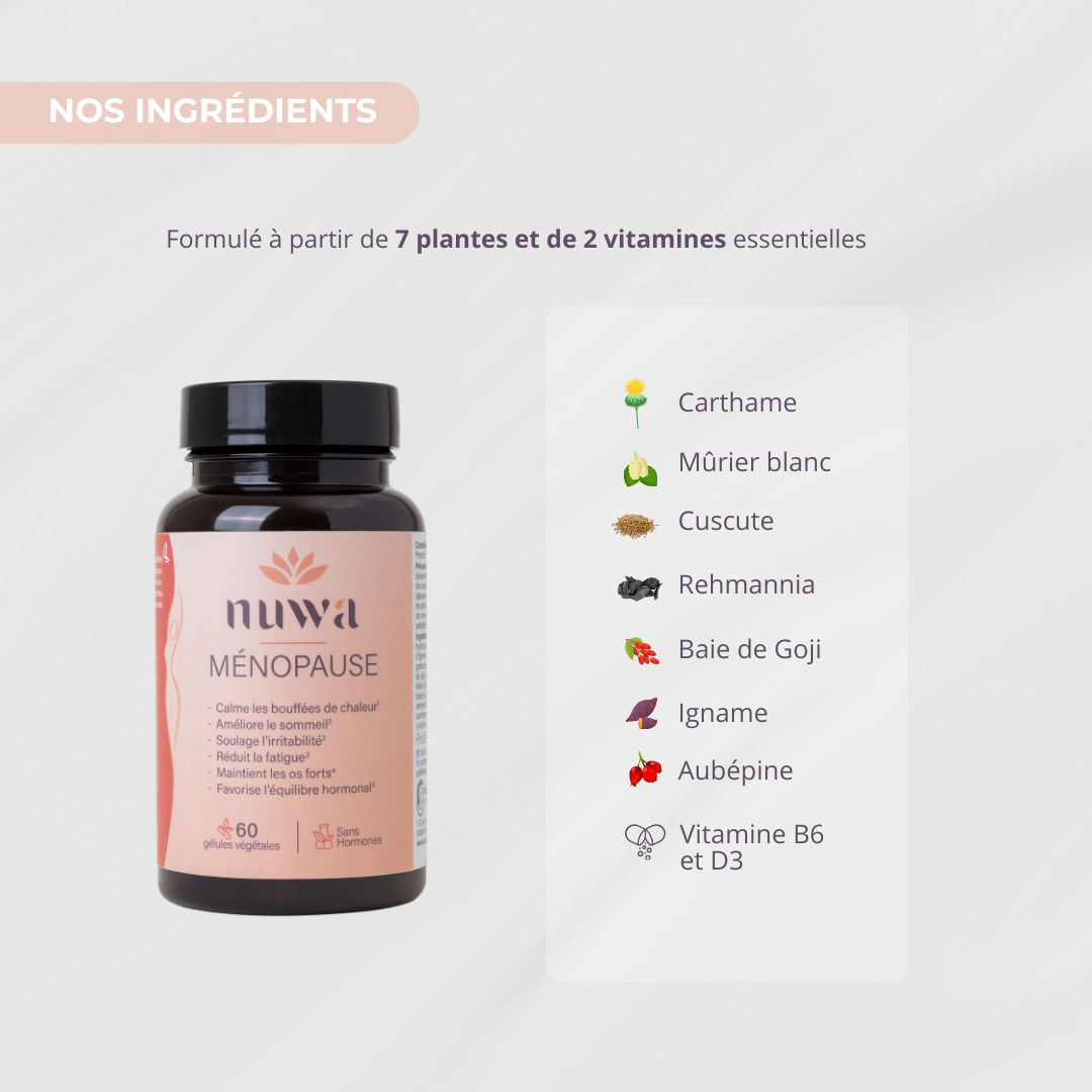La ménopause n’est pas une fin, mais une transformation. C’est une étape naturelle de la vie, souvent marquée par des bouleversements hormonaux pouvant engendrer des inconforts physiques et émotionnels. Bien qu’elle ne soit pas une maladie, cette transition peut avoir un impact significatif sur le bien-être global. Et vous méritez le meilleur pour la traverser. Chez Nuwa, nous avons à cœur d’accompagner les femmes durant cette période avec des solutions douces, naturelles et efficaces, spécialement conçues pour les aider à retrouver leur équilibre et sérénité, grâce à une synergie d’actifs d'origine naturelle, choisis pour leur efficacité prouvée.