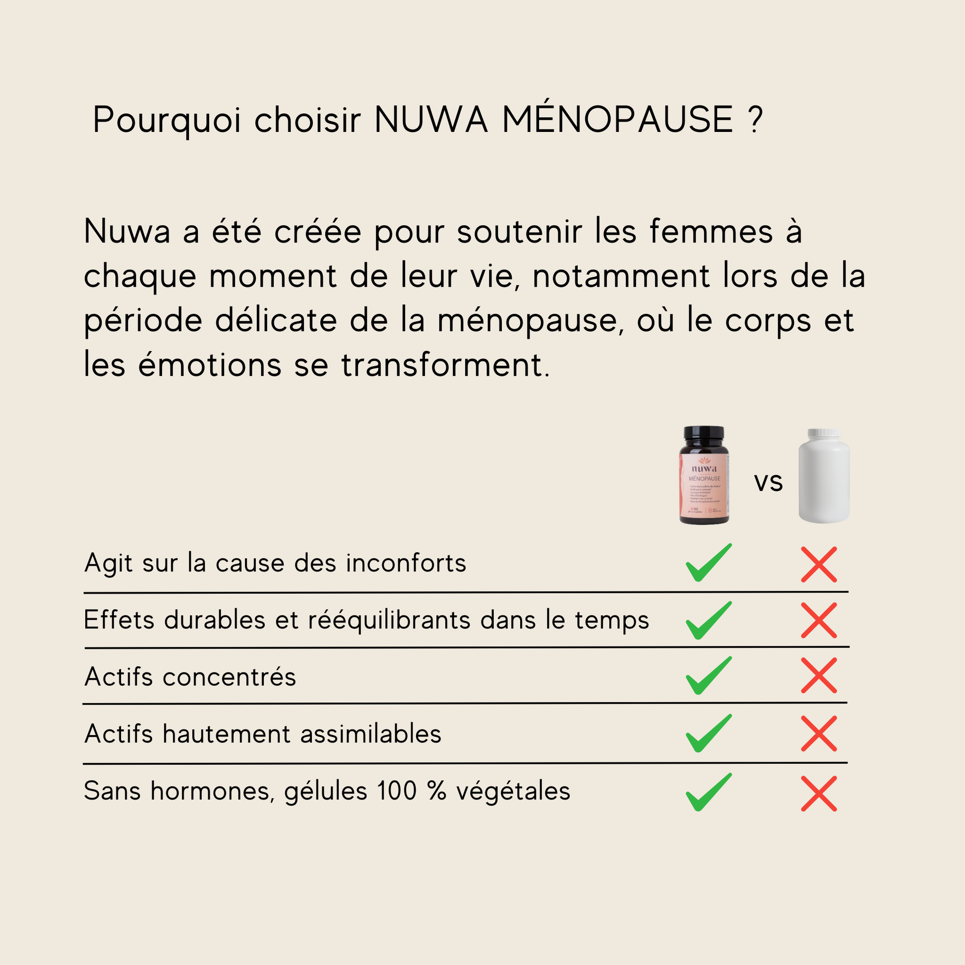 Formulé autour du complexe végétal Menoprogen®, NUWA MÉNOPAUSE associe des extraits de plantes et des vitamines clés (B6, D3) pour accompagner la transition hormonale sans phyto-œstrogènes ni ingrédients controversés.