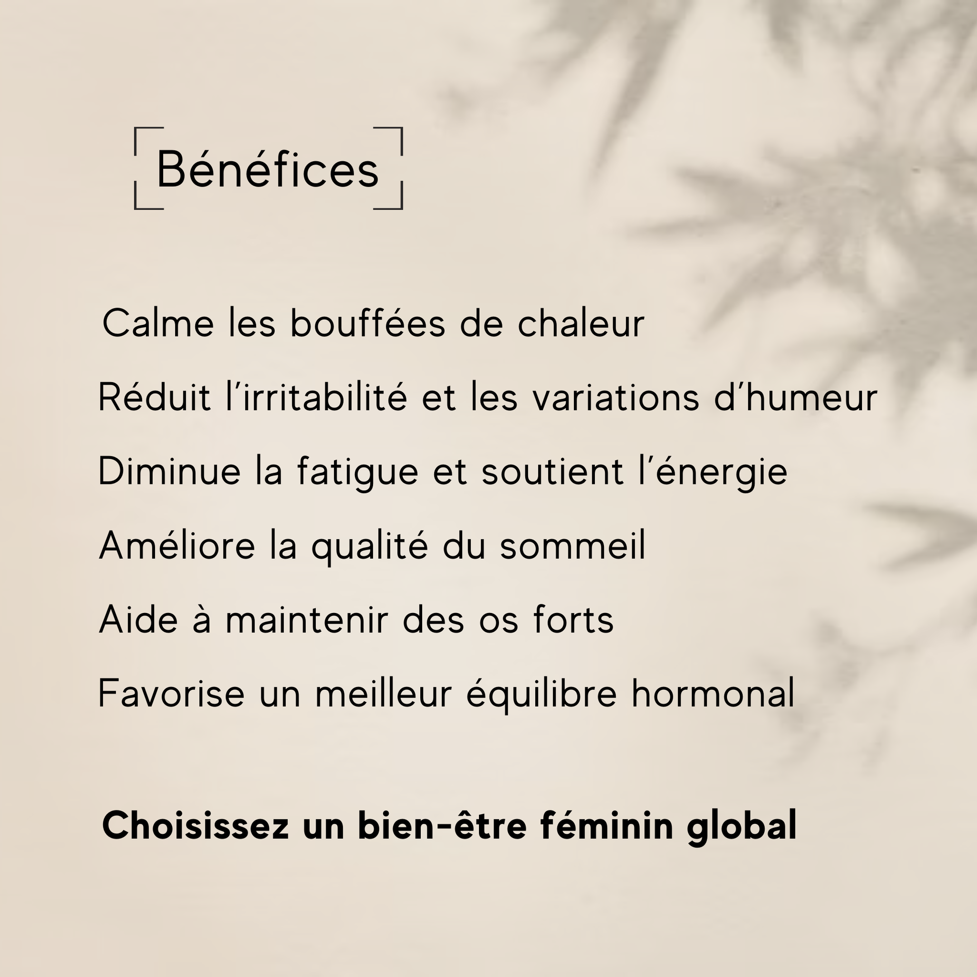 Traversez la ménopause avec confort : moins de bouffées de chaleur, un meilleur sommeil, un moral apaisé.